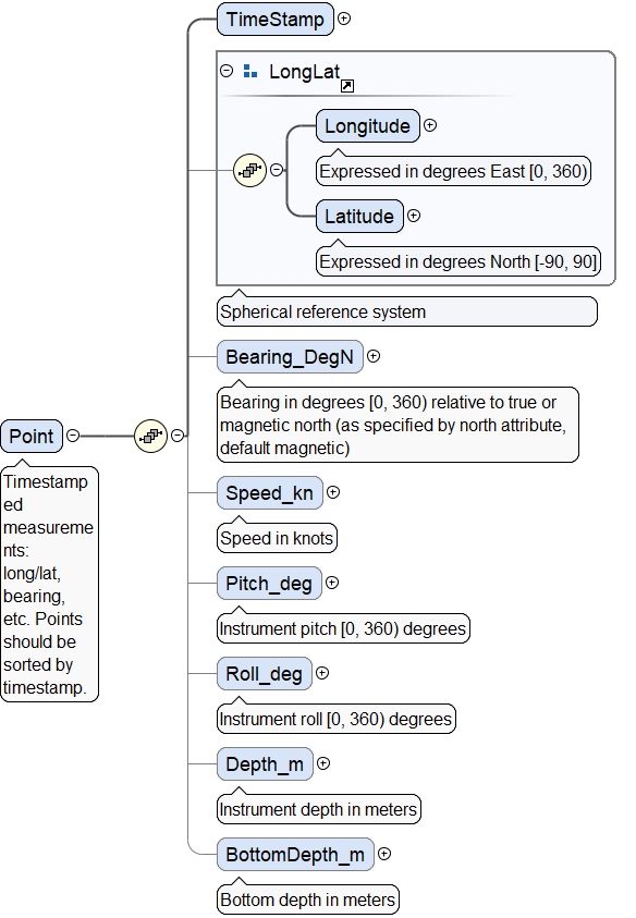 <xs:element maxOccurs="unbounded" minOccurs="0" name="Points"><xs:annotation><xs:documentation>A set of sorted (by time) points associated with one or more tracklines.</xs:documentation></xs:annotation><xs:complexType><xs:sequence><xs:element minOccurs="0" name="Trackline" type="xs:double"><xs:annotation><xs:documentation>Optional trackline number. If unimportant, everything can be put in one Points element.</xs:documentation></xs:annotation></xs:element><xs:element name="Point" maxOccurs="unbounded"><xs:annotation><xs:documentation>Timestamped measurements: long/lat, bearing, etc. Points should be sorted by timestamp.</xs:documentation></xs:annotation><xs:complexType><xs:sequence><xs:element name="TimeStamp" type="xs:dateTime"/><xs:group minOccurs="0" ref="LongLat"/><xs:element minOccurs="0" name="Bearing_DegN"><xs:annotation><xs:documentation>Bearing in degrees [0, 360) relative to true or magnetic north (as specified by north attribute, default magnetic)</xs:documentation></xs:annotation><xs:complexType><xs:simpleContent><xs:extension base="BearingDeg"><xs:attribute default="magnetic" name="north"><xs:simpleType><xs:restriction base="xs:string"><xs:enumeration value="true"/><xs:enumeration value="magnetic"/></xs:restriction></xs:simpleType></xs:attribute></xs:extension></xs:simpleContent></xs:complexType></xs:element><xs:element name="Speed_kn" type="xs:double" minOccurs="0"><xs:annotation><xs:documentation>Speed in knots</xs:documentation></xs:annotation></xs:element><xs:element minOccurs="0" name="Pitch_deg"><xs:annotation><xs:documentation>Instrument pitch [0, 360) degrees</xs:documentation></xs:annotation><xs:simpleType><xs:restriction base="xs:double"><xs:minInclusive value="0"/><xs:maxExclusive value="360"/></xs:restriction></xs:simpleType></xs:element><xs:element minOccurs="0" name="Roll_deg"><xs:annotation><xs:documentation>Instrument roll [0, 360) degrees</xs:documentation></xs:annotation><xs:simpleType><xs:restriction base="xs:double"><xs:minInclusive value="0"/><xs:maxExclusive value="360"/></xs:restriction></xs:simpleType></xs:element><xs:element minOccurs="0" name="Depth_m" type="xs:double"><xs:annotation><xs:documentation>Instrument depth in meters</xs:documentation></xs:annotation></xs:element><xs:element name="BottomDepth_m" type="xs:double" minOccurs="0"><xs:annotation><xs:documentation>Bottom depth in meters</xs:documentation></xs:annotation></xs:element></xs:sequence></xs:complexType></xs:element></xs:sequence></xs:complexType></xs:element>