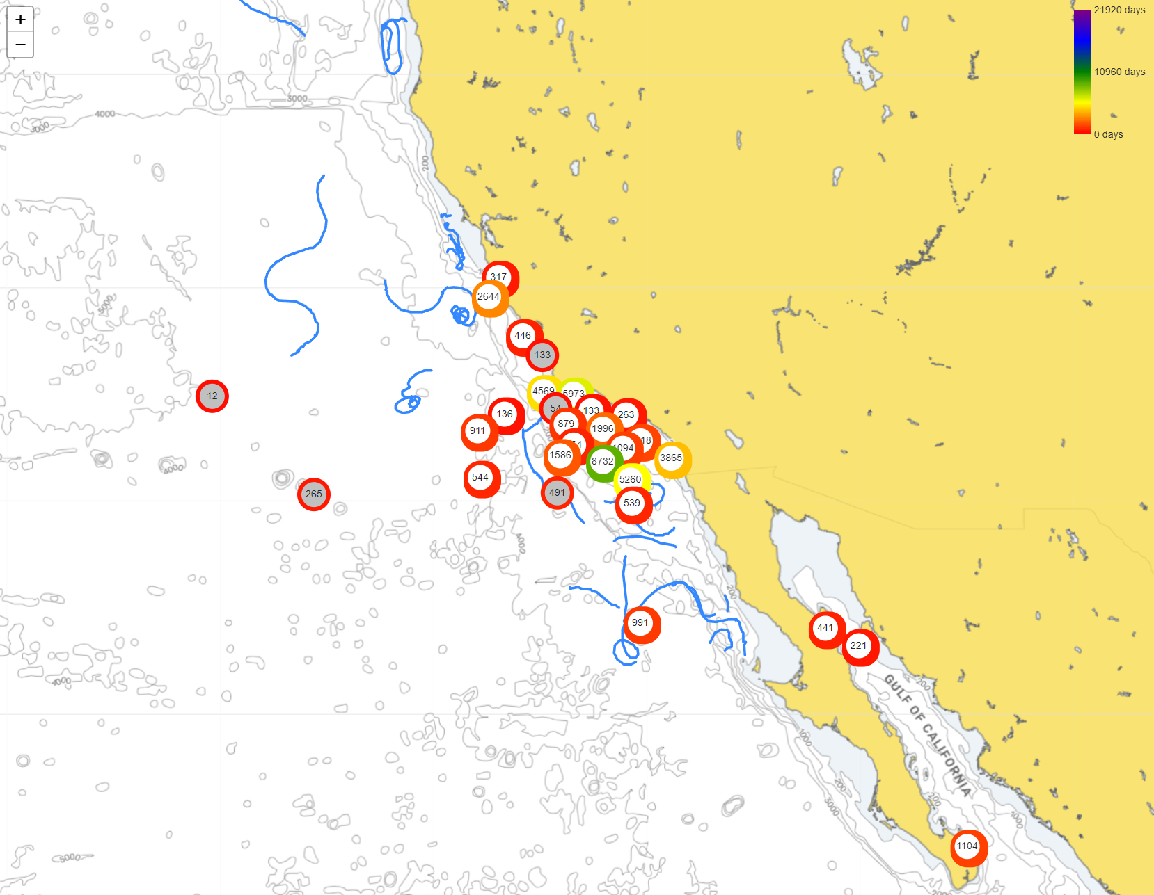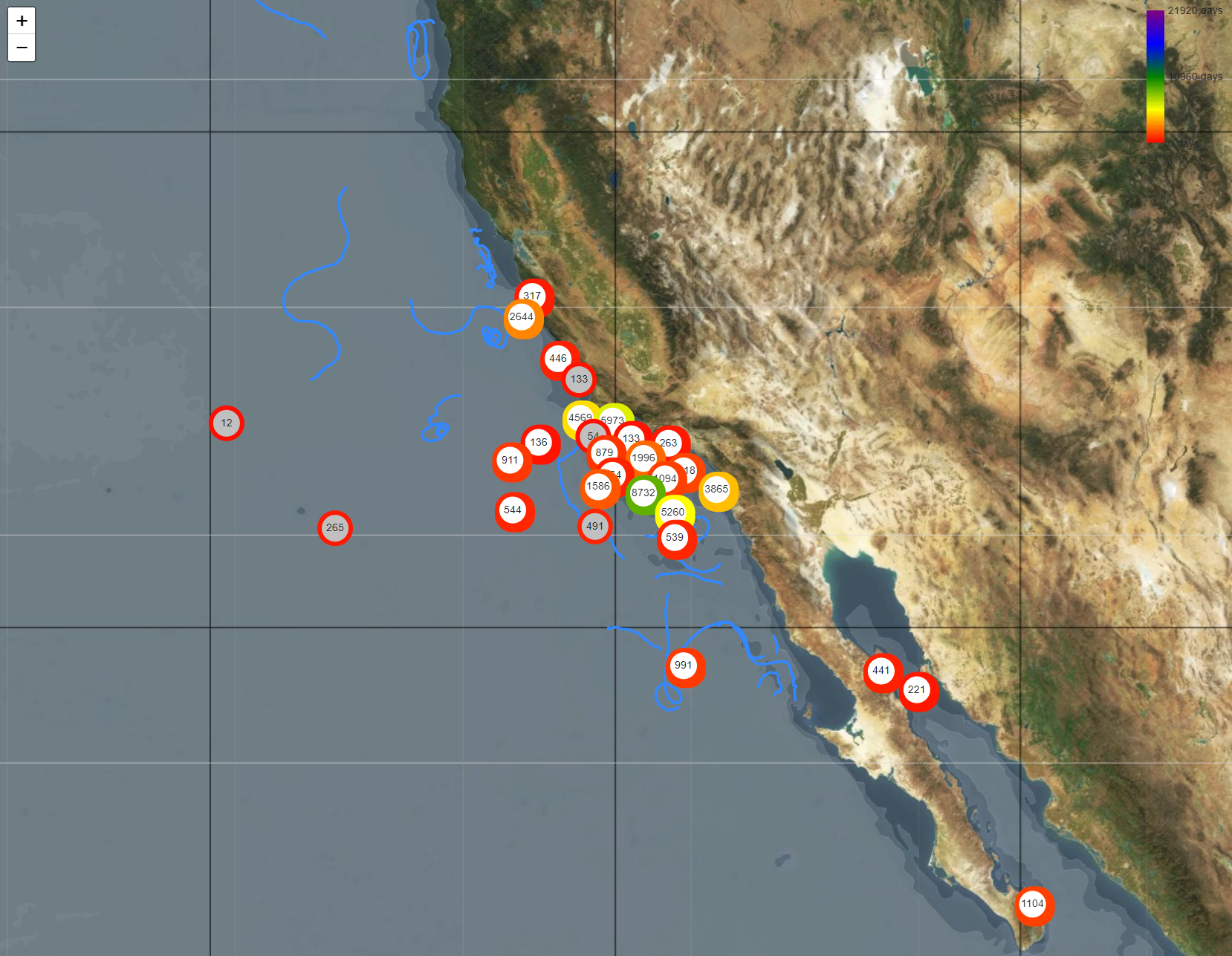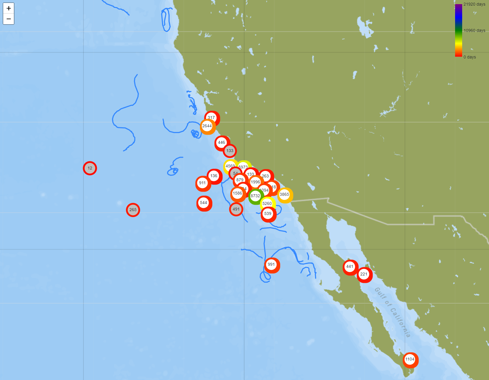 You can zoom in and out on the resulting map (Figure 2). Zooming is accomplished by either using the +/- icons on the map or using a zoom action (middle mouse wheel, two-finger spread/pinch on trackpad or touch screen). To pan, click and hold the mouse and move while holding, or tap and move your finger on a touch pad, or simply touch the screen and move your finger. Zoom out now until you can see all of the deployments.